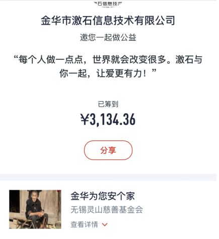 金華市愛一起公益協會在2016年4月份由11位發起人注冊登記,也是金華市2016年以來***家直接注冊登記的公益社會組織,協會一直致力于農村孤寡老人的關愛項目,今年的9月9日騰訊公益日,金華愛一起協會再一次發起“金華為您安個家”項目的捐款,金華市激石信息技術有限公司,助力項目的捐款行動,***時間進行項目的的號召與呼吁,螢火蟲愛心社捐出3000元,有一些小伙伴另外又單獨進行了愛心支持。
